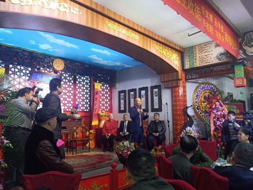 拜师会的主持人高吉林先生,吉语联翩,声动艺林,引得众人阵阵笑声,鼎沸华堂。相声拜师会,谨遵古礼。师傅师娘慈颜和穆,正襟端坐, 四佳徒行跪拜大礼,此刻掌声响起,经久不息。众人贺喜之际,有一艺坛耆宿,见此情景,手拈长髯,不禁颔首称赞:“良师难寻,佳徒亦难觅也,时和气润,今天真是个好日子,可喜可贺”!