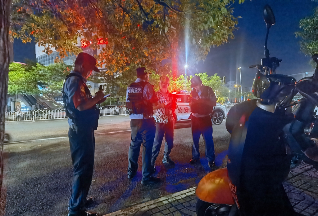 这是海口市公安局琼山分局国兴派出所民警在夏季治安打击整治行动中积极履行“守夜人”职责的一幕。
