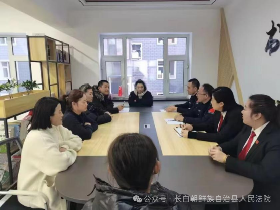 (图为:长白人民法庭法官与金华乡政法委员、司法所所长座谈)