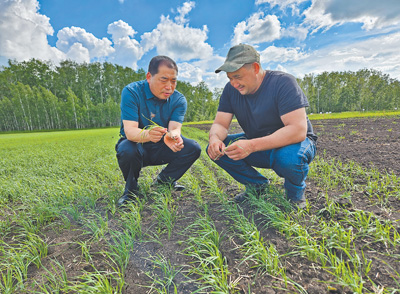 在哈萨克斯坦小麦试验田里,来自西北农林科技大学的中方小麦育种专家(左)给当地技术员讲解小麦苗期管理知识。 |
