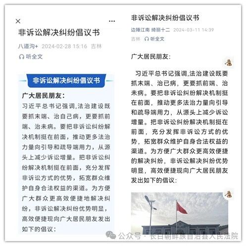 倡议书在辖区乡镇各类平台发布后,辖区居民对非诉纠纷解决有了初步的了解,同时也拓宽了居民维护自身合法权益的途径。在接下来的工作中,八道沟人民法庭将继续以人民为中心,探索便民利民途径,为辖区群众带来实打实的优质司法服务。