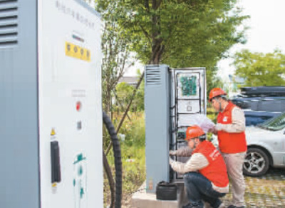 在江苏省海安市曲塘镇一国网充电点,技术人员对新装的充电桩进行调试。翟慧勇摄(人民图片) |
