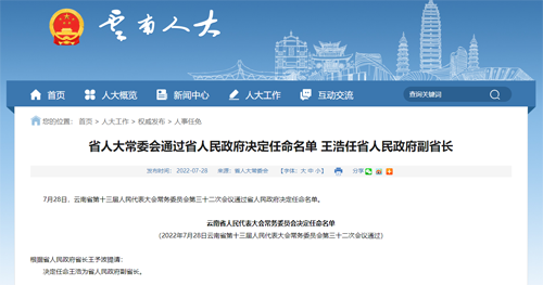 导读: 云南人大官网截图。中国共产党新闻网北京7月29日电(彭静)7月28日,云南人大官网发布云南省人民代表大会常务委员会决定任命名单。根据省人民政府省长王予波提请:决定任命王浩为省人民政府副省长。