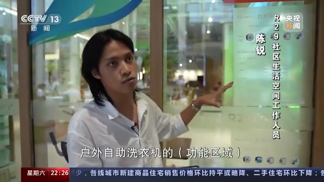 R29社区生活空间工作人员 陈锐:这个区域我们做了这样户外自助洗衣机的功能区域, 需要扫码进入小程序,整个流程是有洗衣服加烘干,这样一单洗下来的话差不多四元钱。