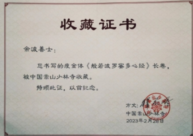 由于19年艰苦的档案文字工作导致严重眼疾,我不得不节省视力,力所能及地坚持写诗、写字。半路出家何其难哉?我从最基本的线条、结体和章法练起,见缝插针地挤出时间耽于翰墨。七年间,我练习毛笔字五十余万字,书写的瘦金体书法长卷和原创古体诗,被中国佛教协会、中国书画家联谊会、韩国书画协会、嵩山少林寺、上海静安寺、香港九龙天台精舍、五台山佛教协会、普陀山佛教书画院、江苏镇江金山寺、深圳弘法寺、江苏宜兴福源禅寺、浙江横店影视城大智禅寺、湖南国画馆、湖北慈光精舍等二十余家机构收藏,并获颁文件或证书;并被韩国、泰国、澳大利亚、德国等文化界、武术界人士收藏。值得一提的是,因为弘扬文化和撰写提案而结缘,我有幸收到32位全国政协委员的亲笔题词,其中有几位省级政协的副主席、中国道教协会会长、中国佛教协会常务副会长、布达拉宫寺管会主任、青海塔尔寺方丈、北京雍和宫方丈和多位大学校长、博物院院长等。这算是对我多年致力于人民政协工作的鼓励。
