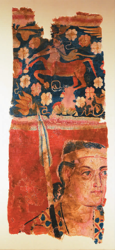汉代蓝地人首马身纹缂毛布色彩鲜艳,极具异域风情。此件原为一幅大型壁挂的局部,后被裁剪成一条裤子,两裤腿已分离。上部为蓝色地,由四瓣花组成的菱格内织出人首马身的“马人”,双手持一长管乐器作吹奏状,身披兽皮向后飘扬;下部是在红色地上织出手持长矛的武士形象,武士深目、高鼻、厚唇,黑发卷曲垂肩,身着饰花带的红长衣。陈克双告诉记者,这种缂毛织物所采用的通经断纬织造技术是由西方传入新疆的,对中国唐宋时期缂丝工艺产生了深远影响。
