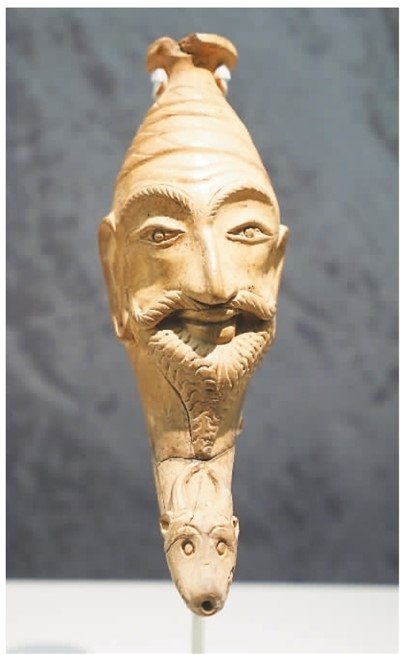 唐代人首微笑牛头陶饮器造型很有特色。此器上部是人首,头顶为平宽沿口,下部是牛头,牛嘴撮拢成小圆孔,上下两部分内腔相通。陈克双介绍,这种饮器造型源自“来通”,即末端为动物形或人首形的角杯,是小亚细亚和地中海地区流行的饮酒器具。